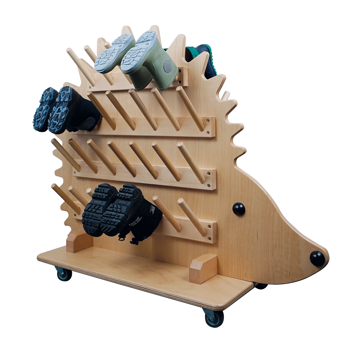 Der niedliche Stiefeligel ist ein echter Liebling bei Kindern und sorgt spielerisch für Ordnung. Bis zu 26 Paar Stiefel finden hier ihren Platz - übersichtlich verteilt auf beide Seiten. Aus massivem Echtholz gefertigt, ist er besonders stabil und langlebig. Die kindgerechte Höhe von 90 cm macht ihn auch für die Kleinsten gut erreichbar. Mit seinen stabilen Rollen lässt sich der Stiefeligel leicht bewegen.